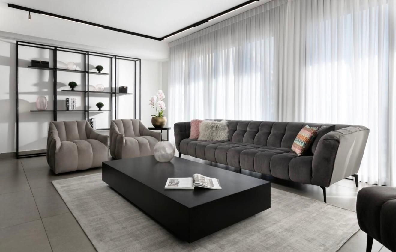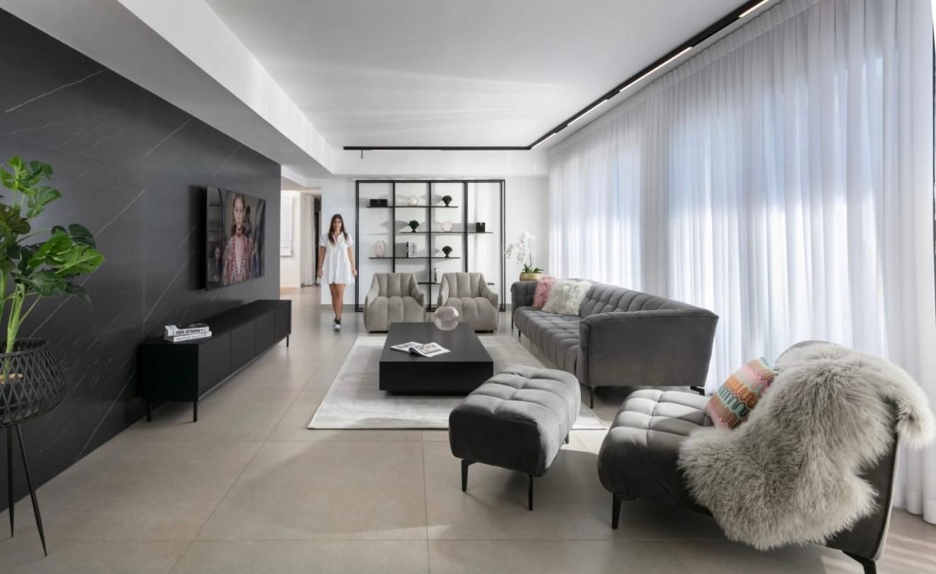 הפרויקט כולל 150 מ״ר פנימיים ומרפסת של כמעט 100 מ״ר. הבית הגיע עם מטבח, רצפה וחדרי רחצה קיימים, ומה שעשינו היה יצירת תאורה חדשה והלבשה מלאה הכוללת וילונות, רהיטים, שטיחים, אקססוריז, וגם עיצוב המרפסת כדי ליצור חלל שלם, מזמין ומעוצב.